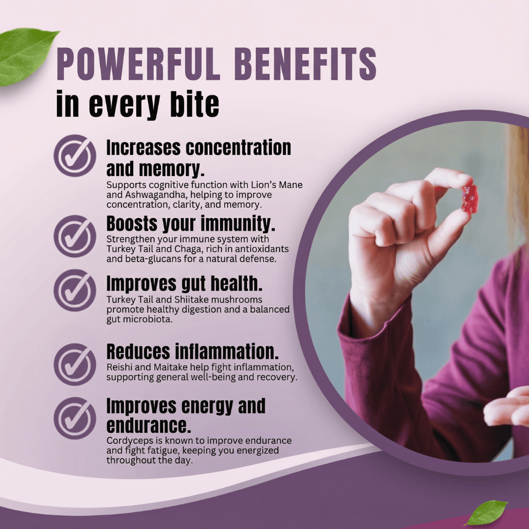 Each gummy contains a blend of Chaga, Maitake, Turkey Tail, Shiitake, Reishi, Cordyceps, Lion’s Mane, and KSM-66 Ashwagandha for a concentrated dose of benefits.